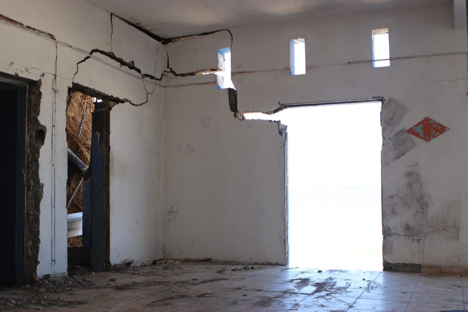 Op het eerste gezicht valt de ellende wel mee. Binnen valt op dat je niet door het dak naar buiten kunt kijken. Een gebogen stucplafond siert de halfdonkere zaal waarvan een paar ramen moeten worden vervangen. Maar het dak erboven ligt open. Verf, vuil en roestwater druipen door het plafond heen langs de muren, en laten olieachtige plassen ontstaan op de stenen vloer. Om het beter te laten zien klikt hij een kroonluchter aan – daardoor maken de muren geluid. Elektriciteit en water is ook in Mozambique blijkbaar geen goede combi. ‘Ik doe hem liever uit, maar zo kunt u eerst even goede foto’s maken’, zegt de priester. Hij vertelt dat ze geen geld hoeven; een kerklid heeft al een aannemer laten komen en geld toegezegd voor de reparaties.