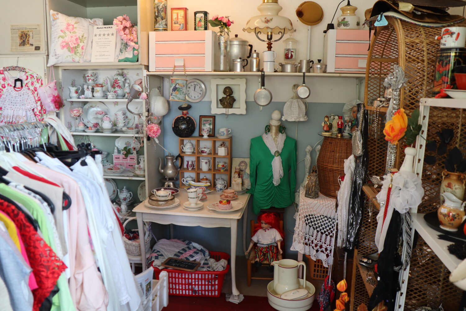 Ik reis af naar het noordelijkste puntje van Friesland. Naar Damwoude, of zoals de Friezen het zeggen: ‘Damwâld’. Hier woont Hermien Meijer. Zij heet me welkom in het winkeltje in de garage van haar huis. Ik kijk mijn ogen uit. Wat een hoeveelheid brocante, curiosa en vintagekleding op zo’n klein oppervlak! Zelfs op de oprit staan nog spullen uitgestald. In één oogopslag zie ik dat hier sprake is van een getalenteerde hand in deze overvolle garageverkoop.