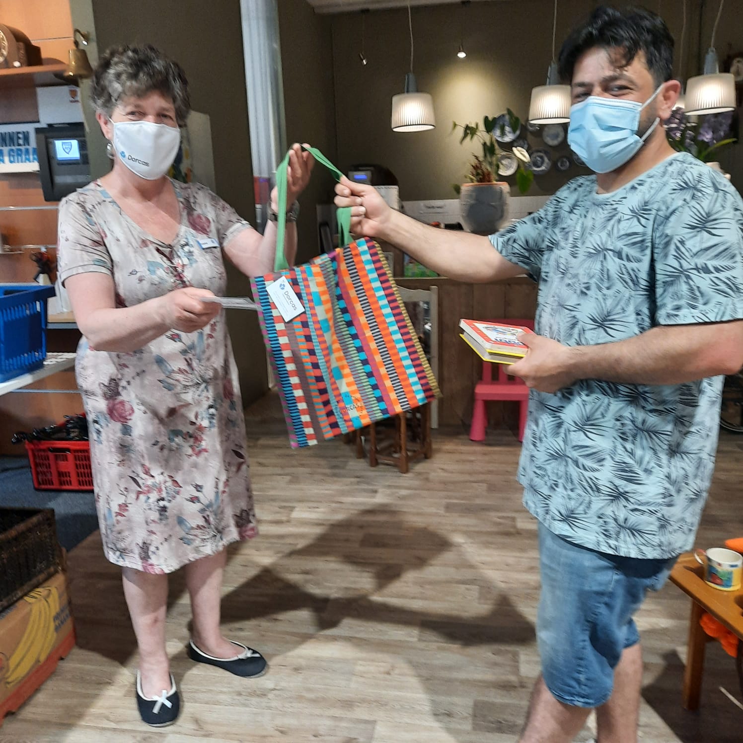 Het Handwerkatelier van Dorcas kreeg de vraag of het iets kon maken voor de winkelacties rond 40 jaar Dorcas. Het ging om een leuk cadeautje voor de klanten. ‘We gingen deze creatieve uitdaging graag aan’, vertelt Yvon van der Meer. ‘We besloten tassen te gaan maken. Met toch wel lichte spanning wachtten wij af hoeveel winkels interesse hadden en hoe groot de bestelling zou worden. Het werden er in totaal 142!’