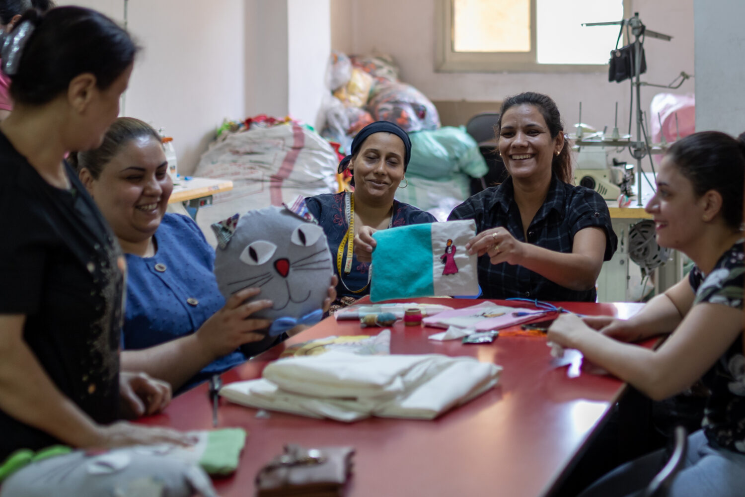 In die wijk baande ik me een weg door een steegje waar het afval hoog opgestapeld lag, tot ik over de drempel stapte van het gebouw van waaruit we werken. Wat ik daar ervoer, was zo anders dan wat ik buiten voelde en zag. De naam van ons project daar is ‘Oasis’ en zo voelde het ook: als een oase van rust en geborgenheid. Op de bovenste verdieping trof ik een groep vrouwen die me trots lieten zien wat ze hadden gemaakt: knuffels, laptoptassen en babyspullen, waaronder boxkleden en luiertassen. Met de verkoop verdienen ze een broodnodig extraatje.
