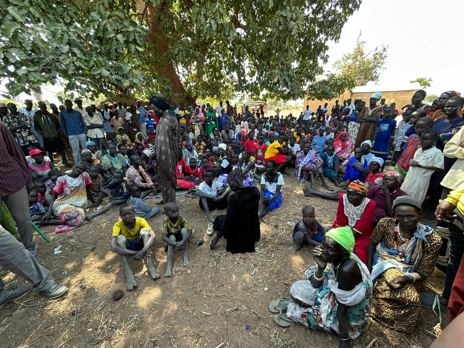 De chief en ik lopen naar het midden van het dorp. Onder een grote boom hebben zich een groot aantal mensen verzameld. Het zijn voornamelijk vrouwen en kinderen. Jaren geleden verlieten deze mensen hun thuisland Zuid-Soedan en zochten een veilig heenkomen in Soedan. Het was hen net gelukt om weer iets van een leven op te bouwen toen er in Soedan oorlog uitbrak.