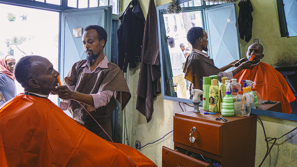 Kapper Eshetee aan het werk in zijn eigen zaak.