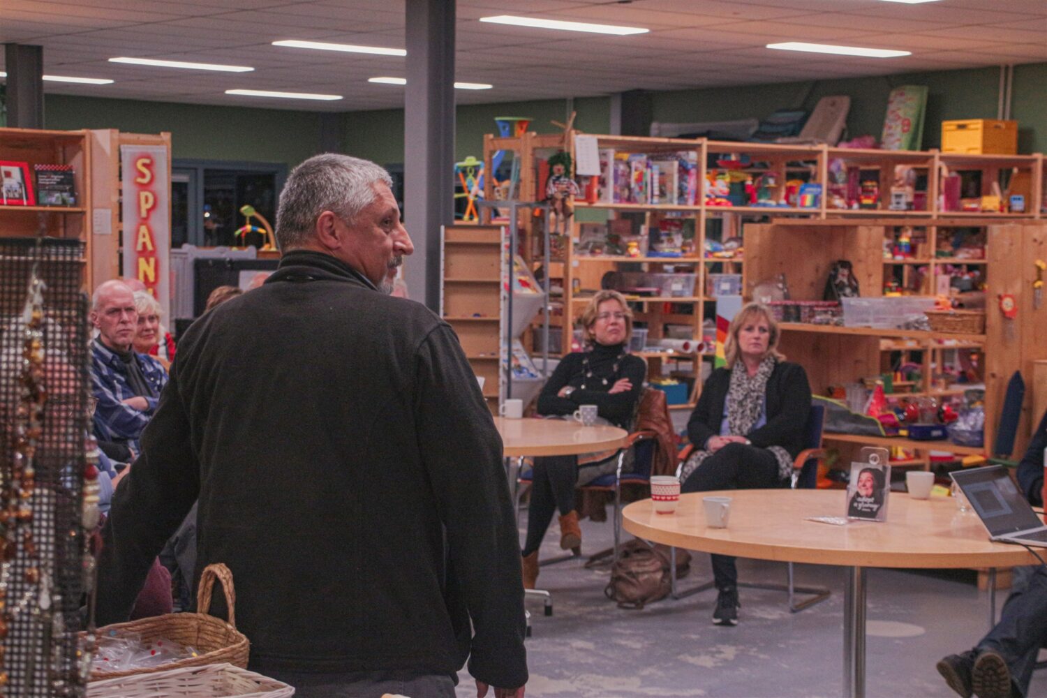 Als de vrijwilligers binnen zijn gedruppeld en koffie en thee hebben gepakt, begint Attila met zijn verhaal. Hij is eerder in de winkel in Dronten geweest en herkent sommige vrijwilligers. ‘Leuk om hier weer te zijn. Voor wie mij nog niet kent, Ik ben Attila en ik werk nu achttien jaar voor Dorcas. Ik woon in Cluj en mijn vrouw en ik hebben vier kinderen.’
