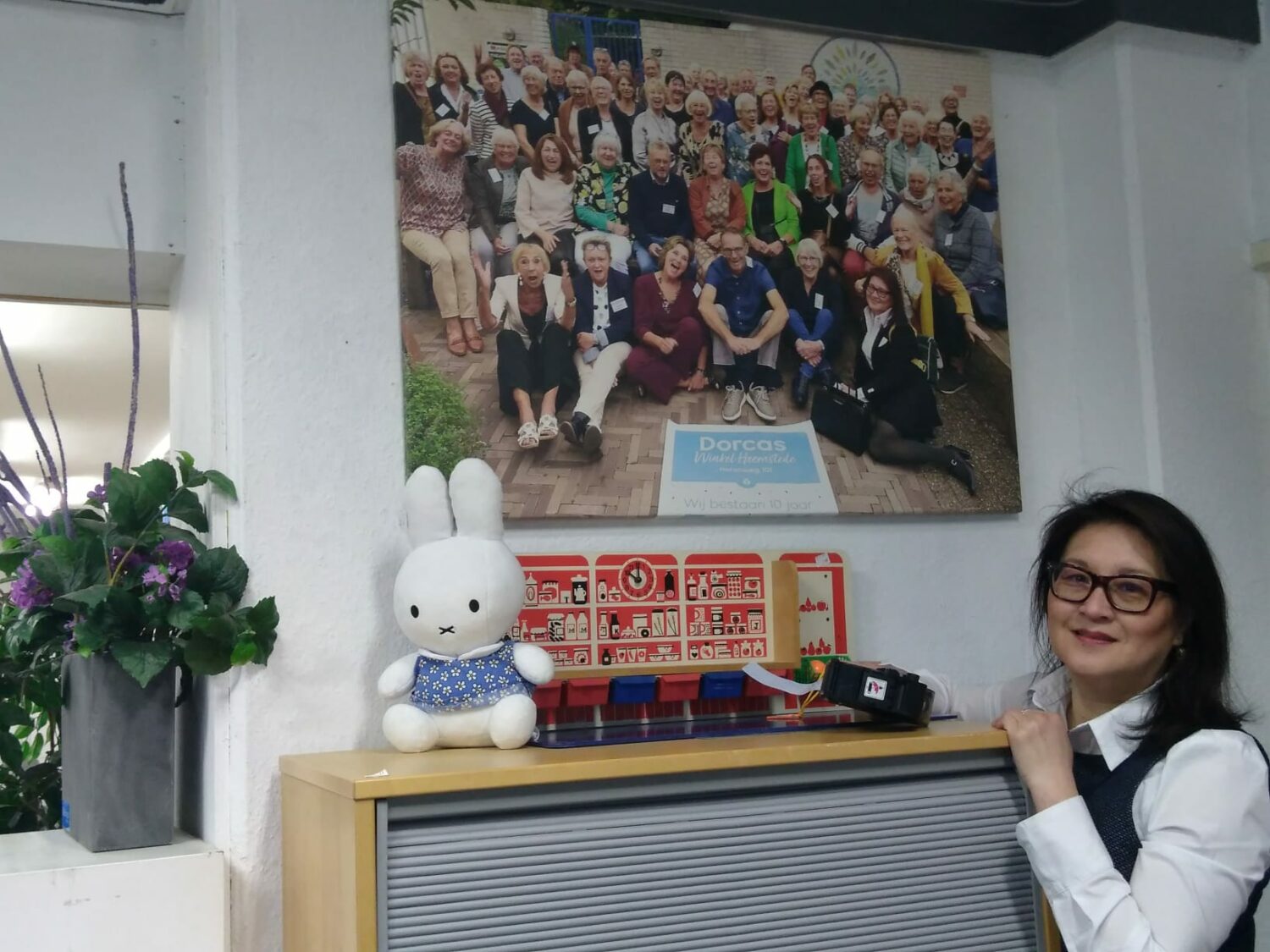 Thing bij een foto met de vrijwilligers van de winkel in Heemstede. Foto: Hannie Penninga