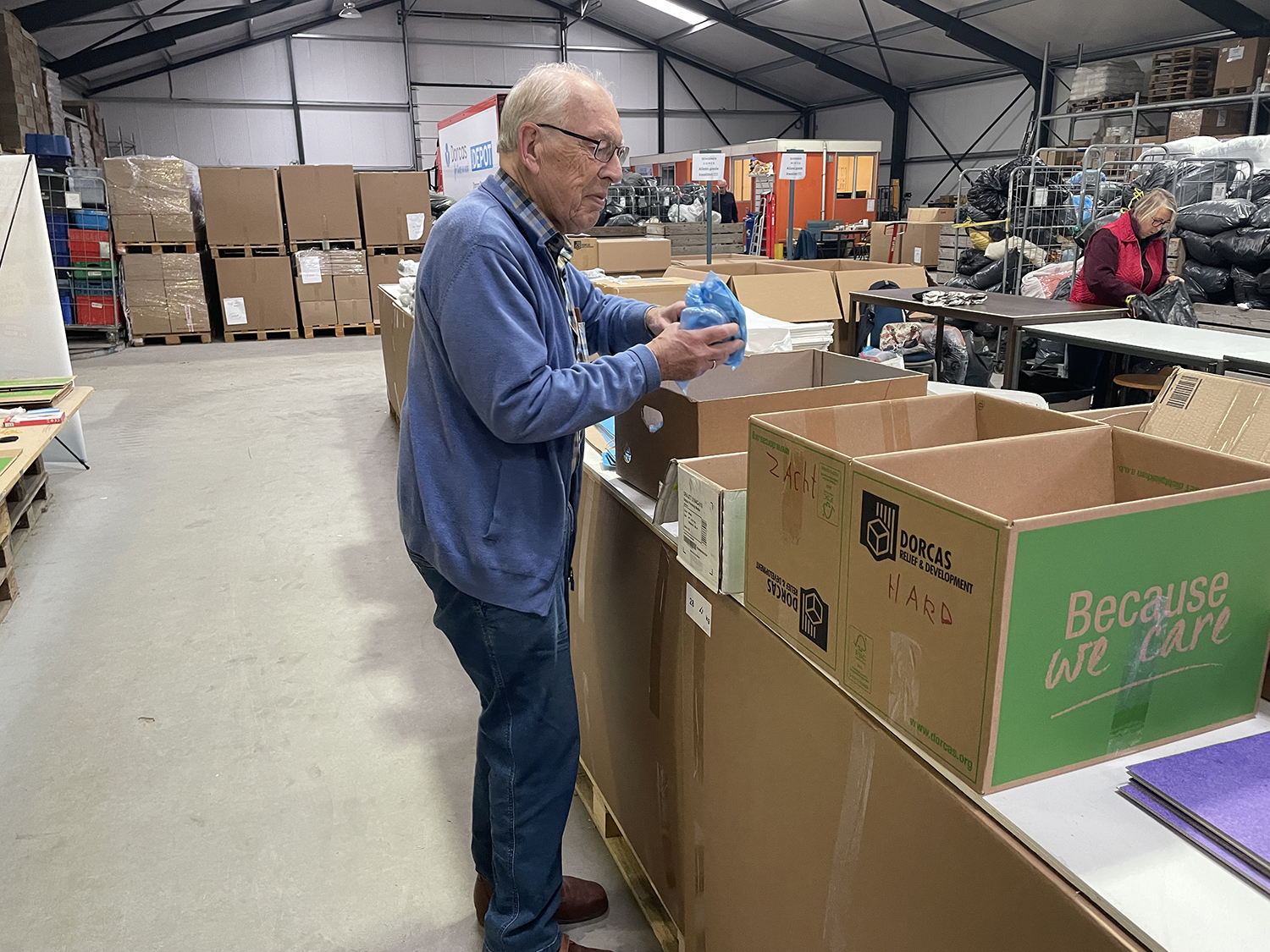In een grote loods aan de rand van Ermelo wordt hard gewerkt voor Dorcas. Tientallen vrijwilligers zijn hier wekelijks druk bezig met het sorteren van kleding, repareren van elektrische apparaten, inpakken van materialen voor de Dorcas Voedselactie en het regelen van transporten naar Roemenië. ‘Ik ben drukker dan voor mijn pensioen. Maar dat geeft niet, het is een leuke ploeg mensen om mee te werken’, lacht vrijwilliger Hans.